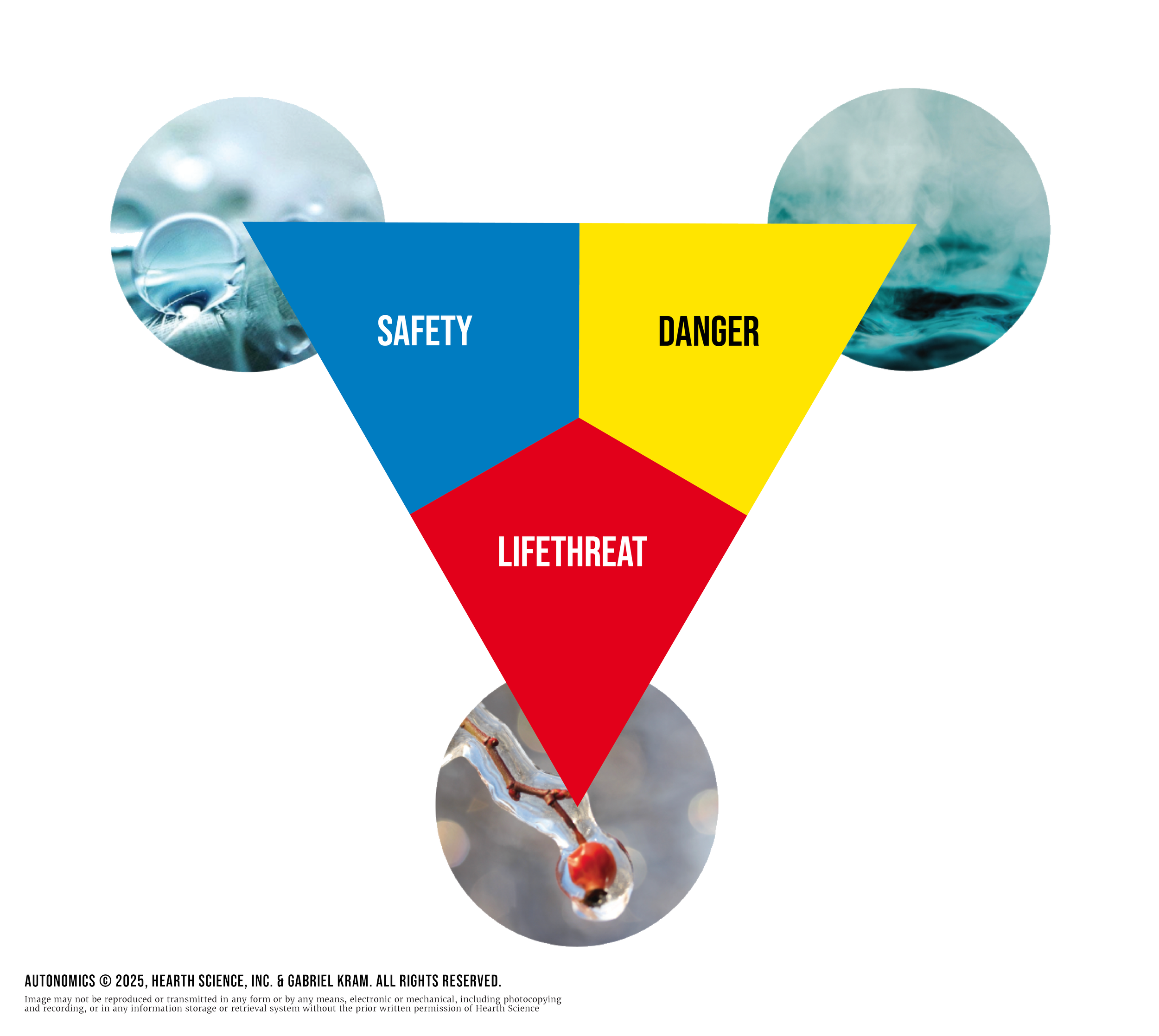 The ANS has three primary states, depending on whether or not we feel safe, in danger, or under life threat in the present moment. We illustrate these with primary colors, like this: